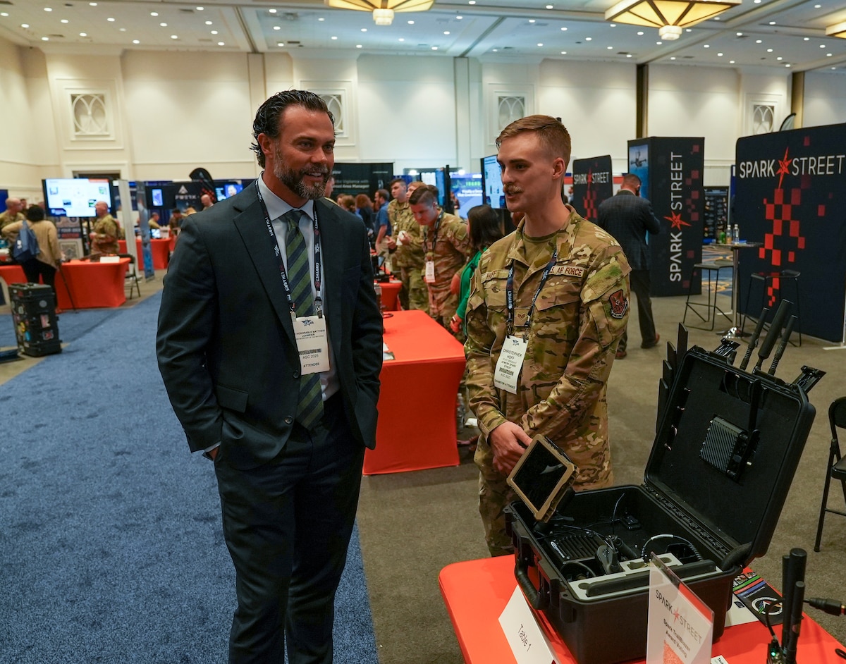 Master Sgt. Matt Workoff, AFWERX Spark, briefs Matthew Lohmeier, Under Secretary of the Air Force, during the Air, Space and Cyber Conference at the Gaylord National Resort and Convention Center in National Harbor, Maryland, on Sept. 23, 2025. Spark Street showcases how Airmen and Guardians are solving operational challenges through grassroots innovation, connecting them with senior leaders and industry partners. This collaborative event accelerates the delivery of mission-critical capabilities aligned with national defense priorities. (U.S. Air Force photo by Matthew Clouse)